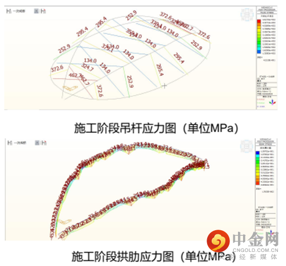 本结构按一次成桥计算施工阶段,吊杆最大应力为462Mpa,拱肋最大应力46.1Mpa、主梁最大应力83Mpa,均满足规范要求。
