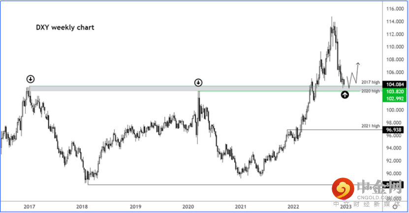 在讨论美元可能反弹的宏观原因之前,让我们快速浏览一下DXY的周线图: