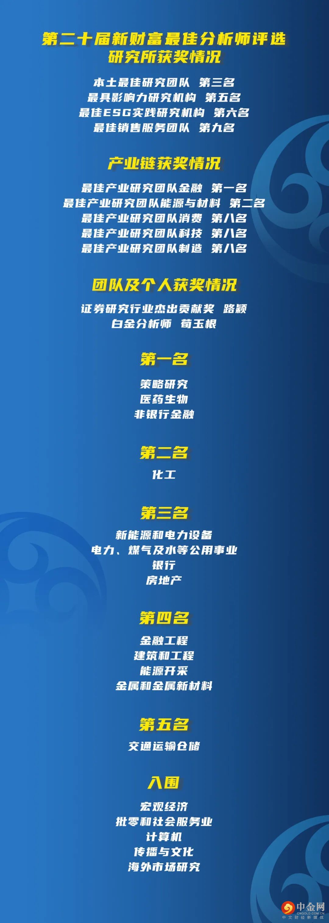 在各研究方向获奖方面,策略、非银金融、医药生物获得第一名;化工获得第二名、房地产、银行、新能源和电力设备、公用事业等获得第三名;金融工程、建筑与工程、能源开采、金属和金属新材料获得第四名;交通运输仓储获得第五名;此外,宏观经济、批零和社会服务业、计算机、传播与文化、海外市场研究等入围最佳分析师评选。