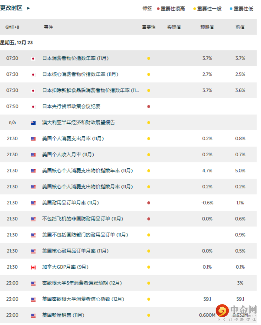 日本CPI、日本央行会议纪要、美国PCE物价指数、美国耐用品订单、加拿大GDP。