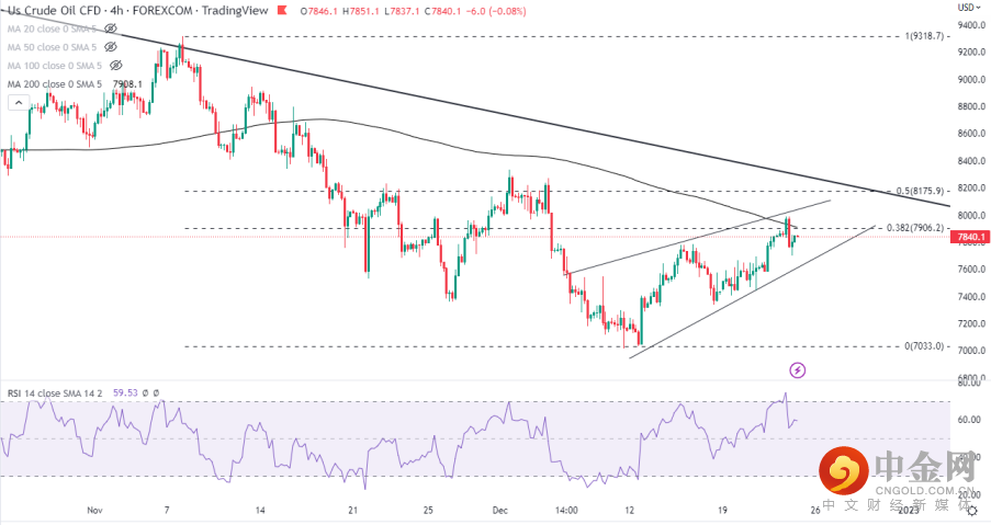 当然,油价仍然处于空头行情之中。当市场消化了乐观预期后会发现,需求的回暖不会一夜之间发生,而美联储的加息还会继续。日线图上的十字星值得留意,若油价跌破上升楔形结构恐延续跌势下探70美元附近的年内低点,甚至跌向65美元一线。