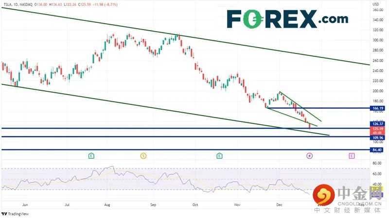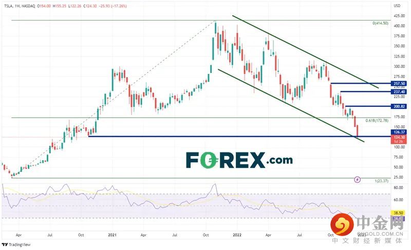 仅在12月,特斯拉股价就从197.08跌至122.26,跌幅超过36%,本月(和本年)还剩6个交易日。特斯拉股价处于2020年9月以来的最低水平。在周线图上,从上周开始,特斯拉股价大幅跌破2020年3月大流行低点至2021年11月历史高点区间的61.8%斐波那契线172.78附近。价格目前正在测试该股自历史高点以来所处的下行通道下沿。