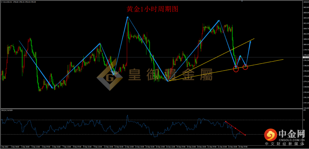 从1H周期走势结构看,黄金昨日出现快速跳水,未能成功守住1800一线,重新回到近期震荡区间,从目前日线结构上来看,黄金目前仍处于自1614开启上涨以来的上涨中继之中,仍未转向空头,从1小时级别RSI来看,目前下降趋势线即将破位,黄金短线有望再度转涨,今日如有回踩机会,可轻仓尝试多单。