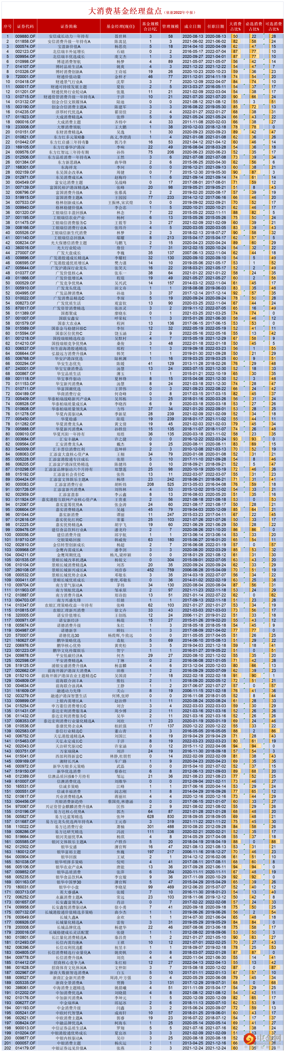 按照上期文章我们划定的10个申万行业为依据,以近一期重要的定期公告(年报/中报)中所公示的行业占比为底层数据,我们筛选出合计占比超过50%的基金经理,初步认定为消费基金经理。