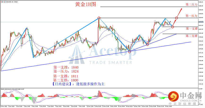 周四亚市早盘,国际黄金价格维持在1820美元/盎司下方窄幅震荡。周三因美元指数持续筑底,金价上冲未果,维持高位震荡。值得注意的是,美联储仍然处于加息周期,且将继续提高利率以压制通货膨胀,即将到来的2023年,美联储仍将加息不少于75基点,这有利于推高美债收益率,且助推美元重回涨势。