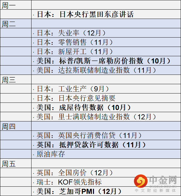 12月月底许多数据已在圣诞节或将在年前公布,比如GDP第三季度数据和核心PCE。市场密切关注日本央行行长黑田东彦本周一的讲话,观察是否会释放量宽信号。此外,美国房市数据和芝加哥PMI指数也备受关注,两个数据是经济放缓与否的重要标志。本周发布的其他数据如下: