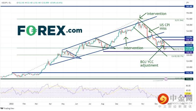 如上文所述,在日本央行宣布调整收益率曲线控制政策后,美元/日元在12月20日跳水500点子,创下年内最大跌幅3.8%。9月22日,日本央行曾出手干预,货币对一度下跌1.22%。随后在10月24日,日本央行再次干预,货币对下挫1.65%。11月10日,美国CPI数值低于预期,美元/日元价格再度走低,跳水3.72%。最后日本央行此次调整利率政策,直接重创货币对价格,创下年内最大跌幅。不过跌势在在8月2日低点暂歇,随后在1月14日全年低点与9月28日全年高点之间的50%回档位遇阻。尽管上周遭受大幅抛压,美元/日元交投价在创下年内高点后,整体处于长期下行通道内。12月20日低点130.56形成第一支撑位。由此向下,货币对可能跌至年内低点至高点之间的61.8%回档水平位128.17。阻力位直接出现在133.62上方。继续向上,价格可能在通道上轨136.00附近突破,随后在12月20日的137.48高点遇阻。