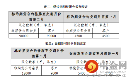 螺纹钢期权合约中,合约月份涉及的标的期货持仓量阈值为100000手(单边)。白银期权合约中,合约月份涉及的标的期货持仓量阈值为20000手(单边)。