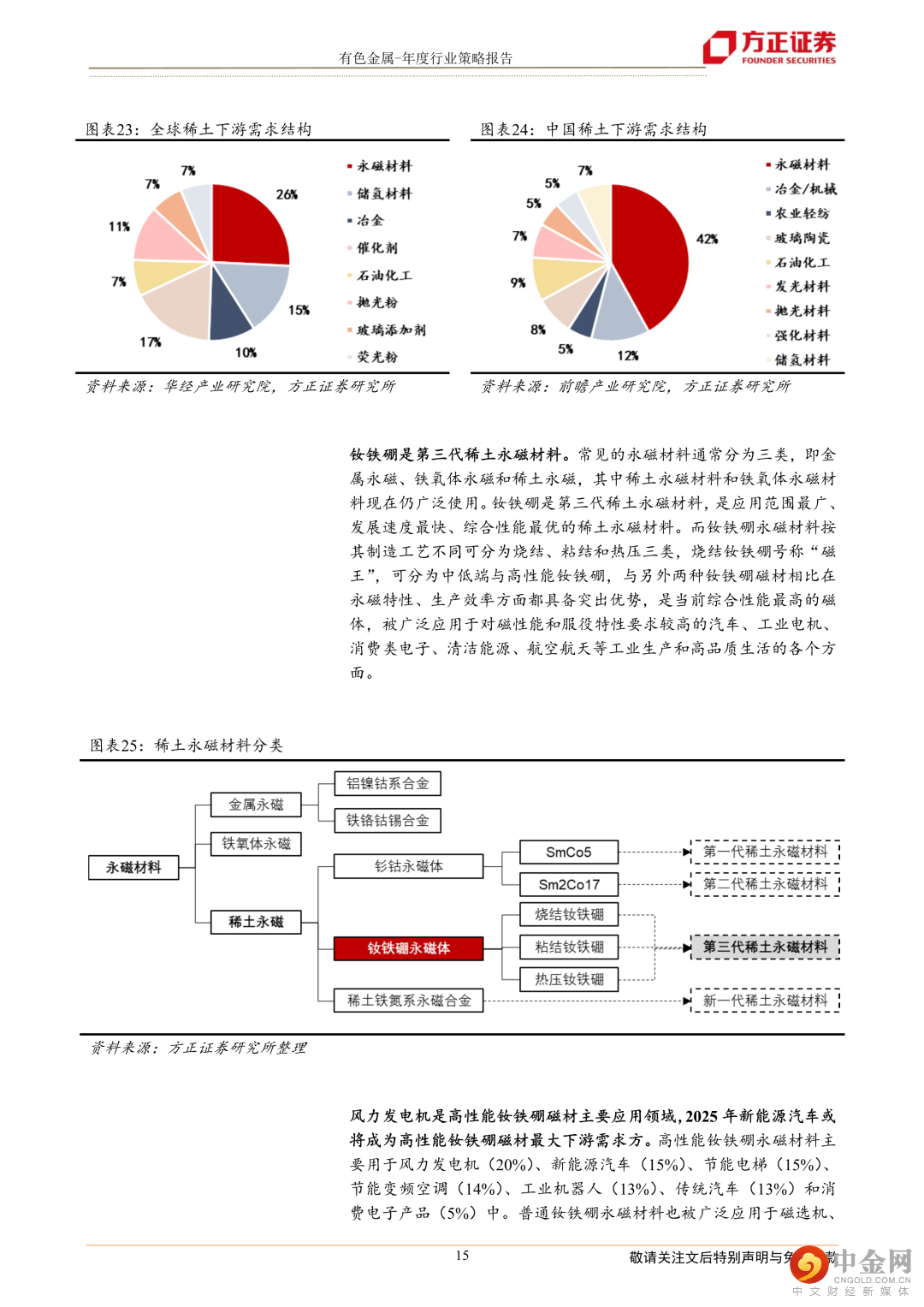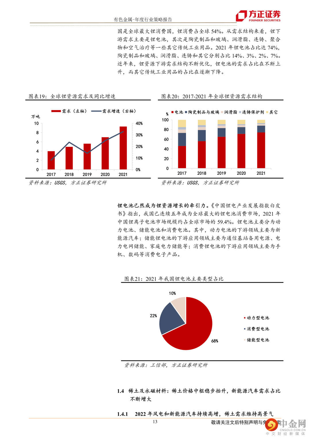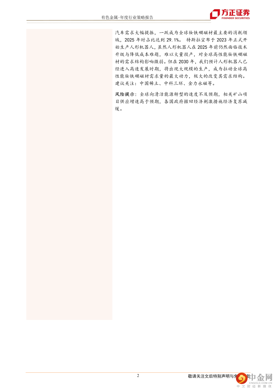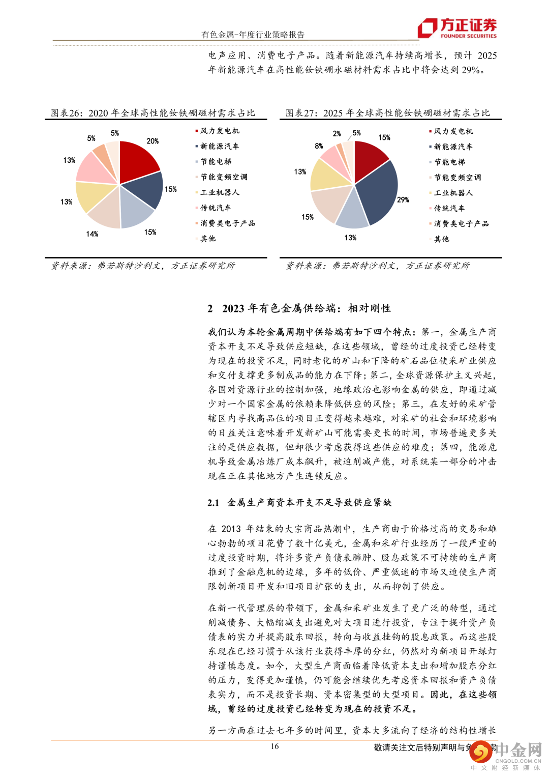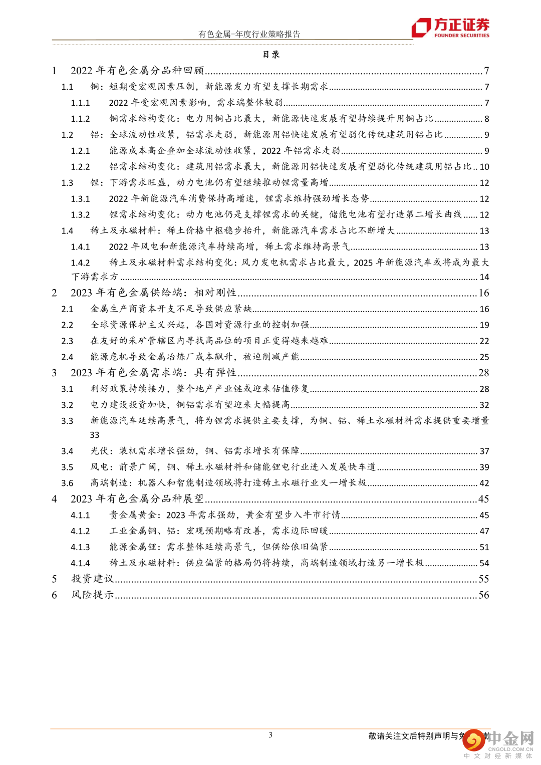 工业金属铜:随着铜资源的开采,剩余资源的稀缺性逐渐增强,铜矿石品位下降制约铜矿产量。全球铜矿资本开支不断下降、品位衰减等导致矿山开采成本抬升、剩余待开发资源相对有限导致矿产稀缺性增强,铜矿全球供给放缓或成事实。新能源行业景气度持续向好对铜下游的需求起到很好的支撑作用,其中光伏、风电和新能源汽车领域用铜需求持续增加。传统终端对铜下游的需求企稳见底,随着对地产支持的组合政策陆续落地,地产行业融资渠道全面打开。政策对于地产链的复苏起到作用,从而减少地产行业下滑对铜下游需求带来的负面影响。建议关注:紫金矿业、云南铜业等。工业金属铝:供给端,海外能源成本高企,国内运行产能接近顶部,预计2023年全球电解铝供应增速放缓。需求端,光伏和新能源汽车领域高景气预计带来较高增量,地产受益于支持政策持续发力有望企稳回升,预计2023年电解铝需求大幅回暖。建议关注:中国铝业、云铝股份、神火股份等。能源金属锂:需求端,新能源汽车行业仍处在快速渗透期,光伏、风电等其他新能源领域正步入发展快车道,锂需求仍持续保持高景气。供给端,2023年澳洲锂矿、非洲锂矿、南美盐湖和国内的锂资源均能贡献一定的增量,但在海外投资不确定性增加带来的供应端扰动等因素的影响下,新增项目的进展仍然面临较大的不确定性,整体供应偏紧局面仍难缓解。我们预计2023年将维持供需偏紧格局,锂价仍有很强支撑性。建议关注:天齐锂业、赣锋锂业等。稀土及永磁材料:能源领域高速发展,需求大幅提振,高端制造将成为高性能钕铁硼磁材未来需求的重要推动力。随着未来新能源汽车产业继续维持高速发展,2020-2025年间,新能源汽车需求大幅提振,一跃成为全球钕铁硼磁材最主要的消耗领域,2025年时占比达到29.1%。建议关注:中国稀土、中科三环、金力永磁等。风险提示: 全球向清洁能源转型的速度不及预期,相关矿山项目供应增速高于预期,各国政府撤回经济刺激措施经济复苏减缓。