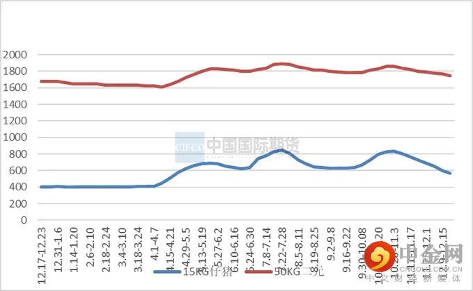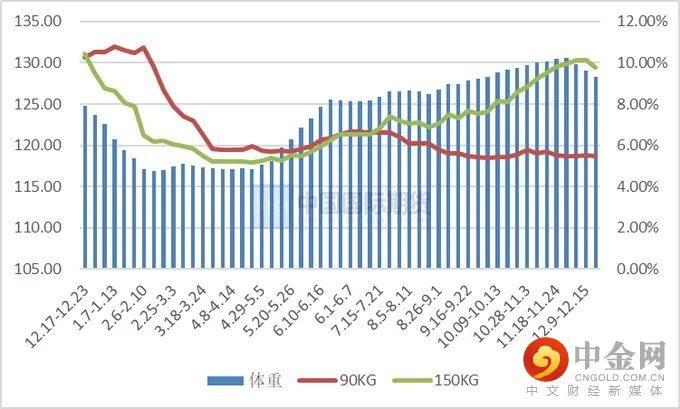上周全国出栏平均体重128.28公斤,环比下降0.61%,150公斤以上出栏占比9.79%,下跌0.32%;90公斤以下占比5.47%,下跌0.06%。猪价持续走低,跌破成本线,养殖户出栏意愿增强,且随冬至到来,南方腌腊高峰期已过,中大猪陆续消耗,部分企业出栏进度亦有所加快,短期内整体出栏体重或进一步下降。