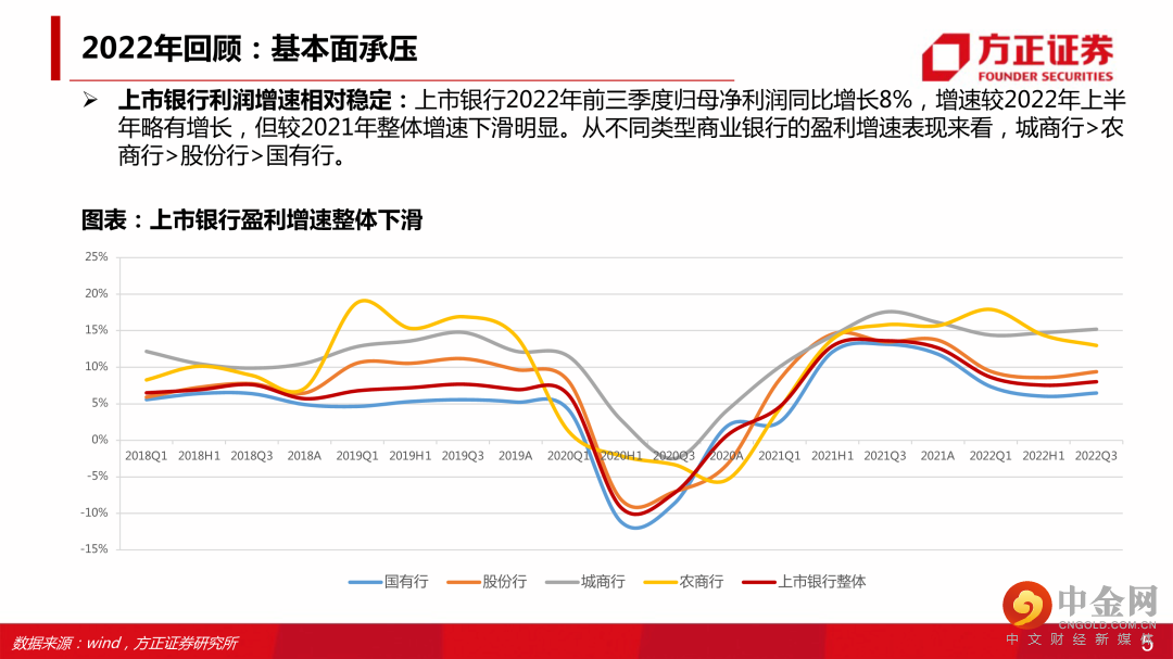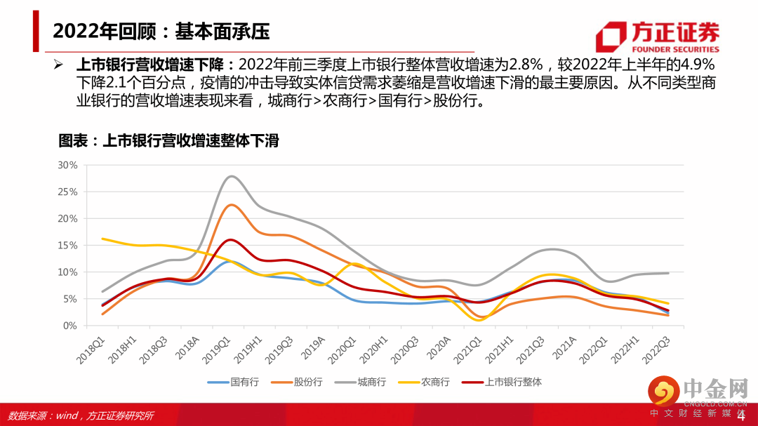 2022年银行板块回顾:受疫情扰动、外部冲击的影响,实体经济有效信贷需求出现萎缩,居民部门消费意愿不旺,上市银行营收增速出现显著回落,前三季度营收增速仅有2.8%,盈利增速表现则好于营收增速。多重不利叠加下,银行板块估值进一步回落,个股之间的表现出现了一定分化。