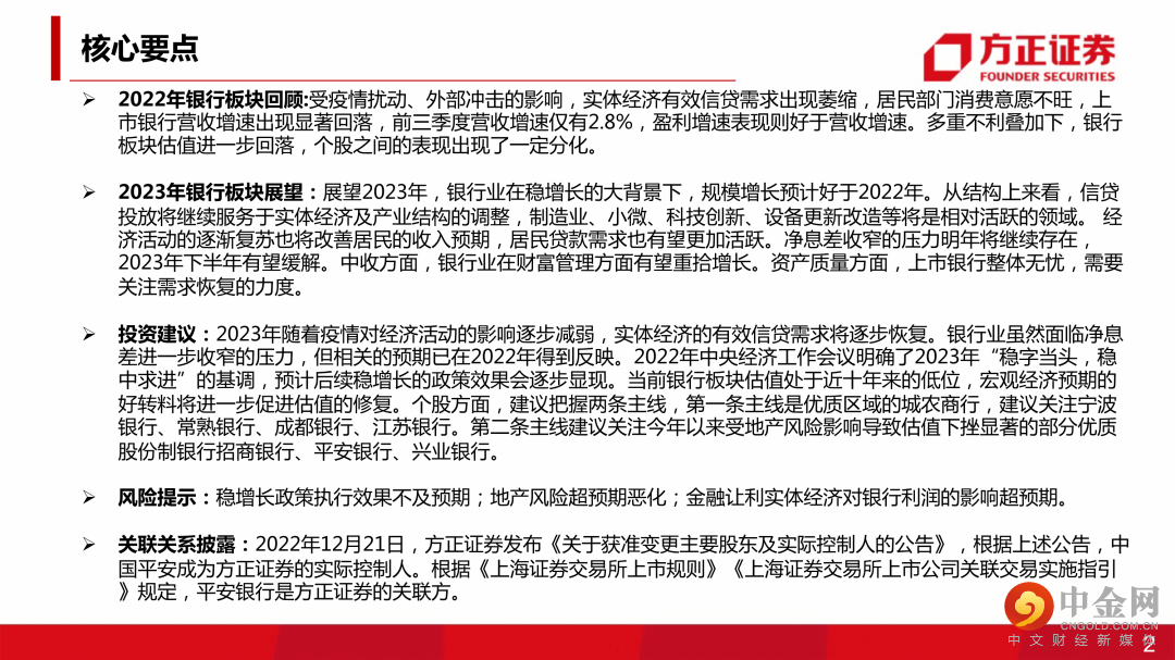 2023年银行板块展望:展望2023年,银行业在稳增长的大背景下,规模增长预计好于2022年。从结构上来看,信贷投放将继续服务于实体经济及产业结构的调整,制造业、小微、科技创新、设备更新改造等将是相对活跃的领域。 经济活动的逐渐复苏也将改善居民的收入预期,居民贷款需求也有望更加活跃。净息差收窄的压力明年将继续存在,2023年下半年有望缓解。中收方面,银行业在财富管理方面有望重拾增长。资产质量方面,上市银行整体无忧,需要关注需求恢复的力度。投资建议:2023年随着疫情对经济活动的影响逐步减弱,实体经济的有效信贷需求将逐步恢复。银行业虽然面临净息差进一步收窄的压力,但相关的预期已在2022年得到反映。2022年中央经济工作会议明确了2023年“稳字当头,稳中求进”的基调,预计后续稳增长的政策效果会逐步显现。当前银行板块估值处于近十年来的低位,宏观经济预期的好转料将进一步促进估值的修复。个股方面,建议把握两条主线,第一条主线是优质区域的城农商行,建议关注宁波银行、常熟银行、成都银行、江苏银行。第二条主线建议关注今年以来受地产风险影响导致估值下挫显著的部分优质股份制银行招商银行、平安银行、兴业银行。风险提示:稳增长政策执行效果不及预期;地产风险超预期恶化;金融让利实体经济对银行利润的影响超预期。关联关系披露:2022年12月21日,方正证券发布《关于获准变更主要股东及实际控制人的公告》,根据上述公告,中国平安成为方正证券的实际控制人。根据《上海证券交易所上市规则》《上海证券交易所上市公司关联交易实施指引》规定,平安银行是方正证券的关联方。