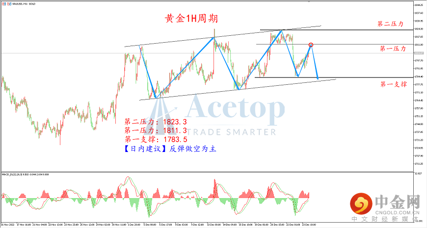 从黄金1H周期图来看,金价自涨到1808.3附近高点以来,行情维持震荡上行,高低点逐步出现抬高,从结构上看,整体走出小级别上升等距通道,通道的上轨测试三次,通道下轨也测试三次,当前价格并未突破通道,目前价格有再次测试通道上轨的可能。从MACD指标来看,虽然双线金叉,但处于零轴下方,表明整体走势依旧偏空,日内可在1811.3附近布局空单。