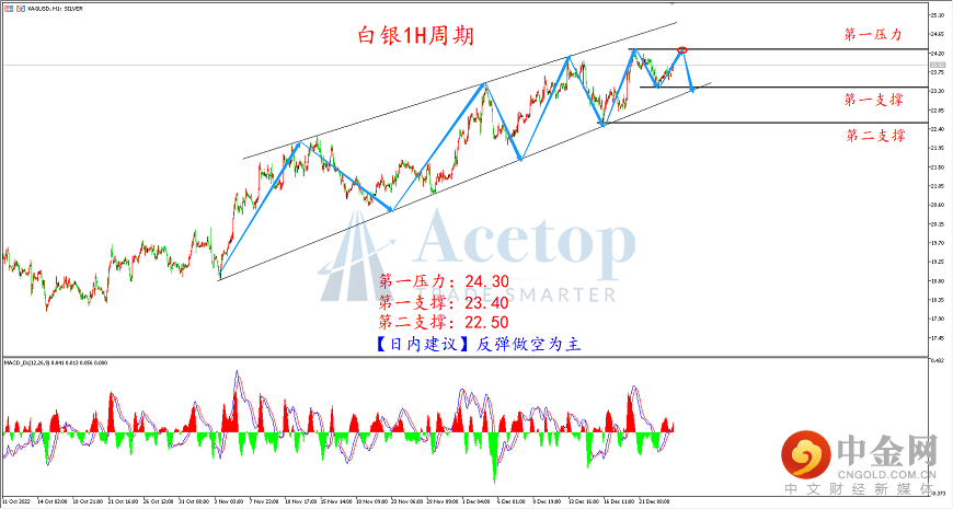 从白银1H周期图来看,白银自18.81附近低点上涨以来,走出高低点逐步抬高的走势,目前上涨趋势运行良好,但运行的上升通道逐渐收窄,说明上涨动能在减弱,价格在前期高点24.27附近受阻后出现承压,并从形态上有走出M顶的可能,短期内价格维持在高位震荡调整概率较高,日内可重点关注空单机会。从MACD指标来看,虽然双线金叉,但处于零轴附近,表明整体走势偏空,日内可在24.30附近布局空单。