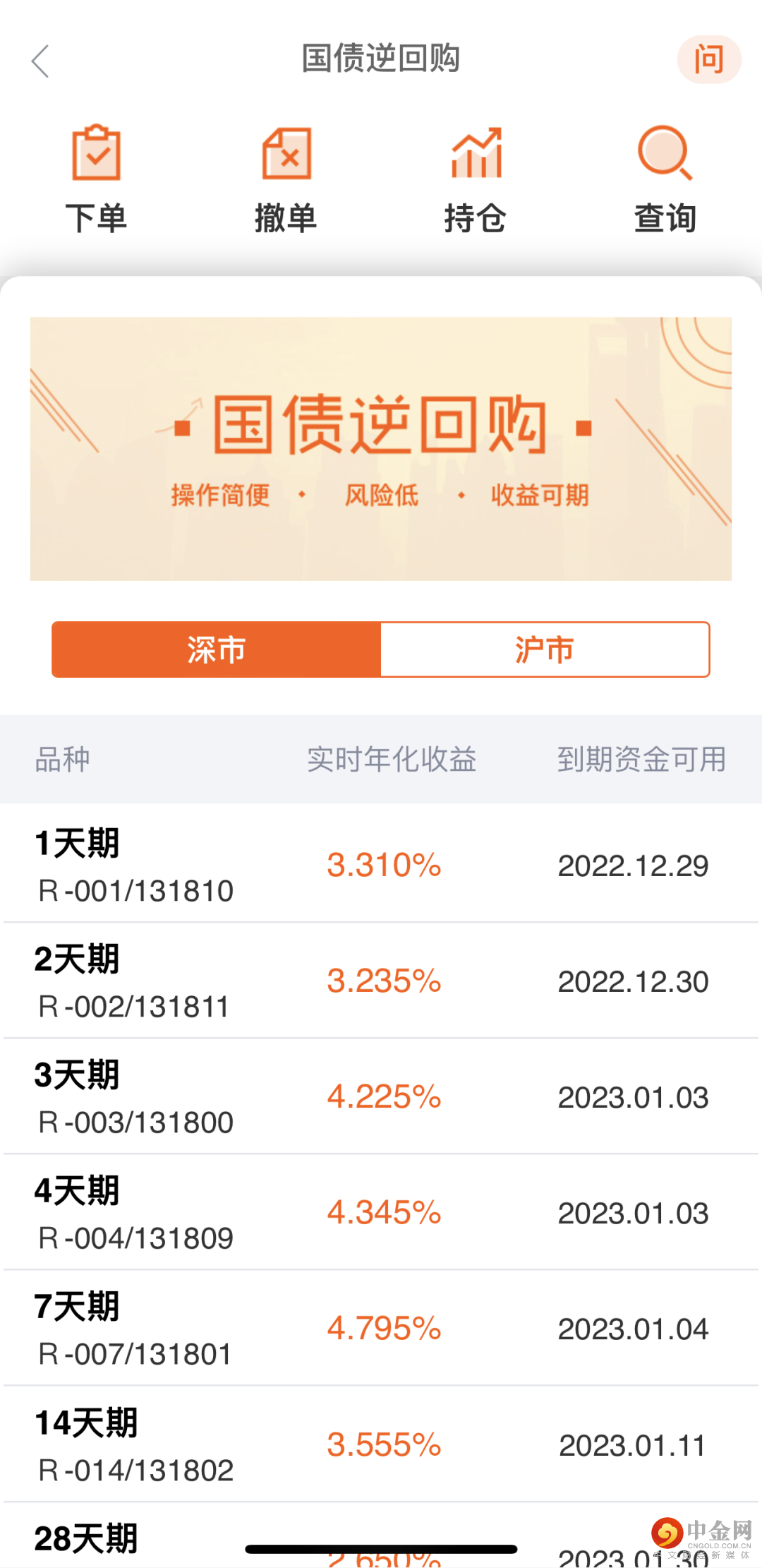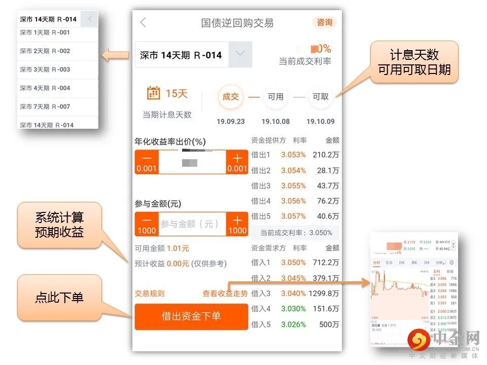 第二步:在国债逆回购首页列表中点击想购买的国债逆回购品种,即可进入“下单”页面。