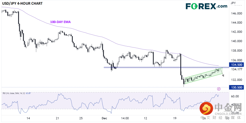 在最初宣布之后,日元兑所有主要货币都不出意料地飙升,但自那之后,该货币在寡淡、低流动性的假期交易期间逐渐回吐了部分涨幅。正如下面的4小时美元/日元图表所示,该货币对正在接近之前从支撑位转化而来的阻力位134.50区域,以及 100日均线,自11月初以来,该均线一直压制着该货币对的反弹: