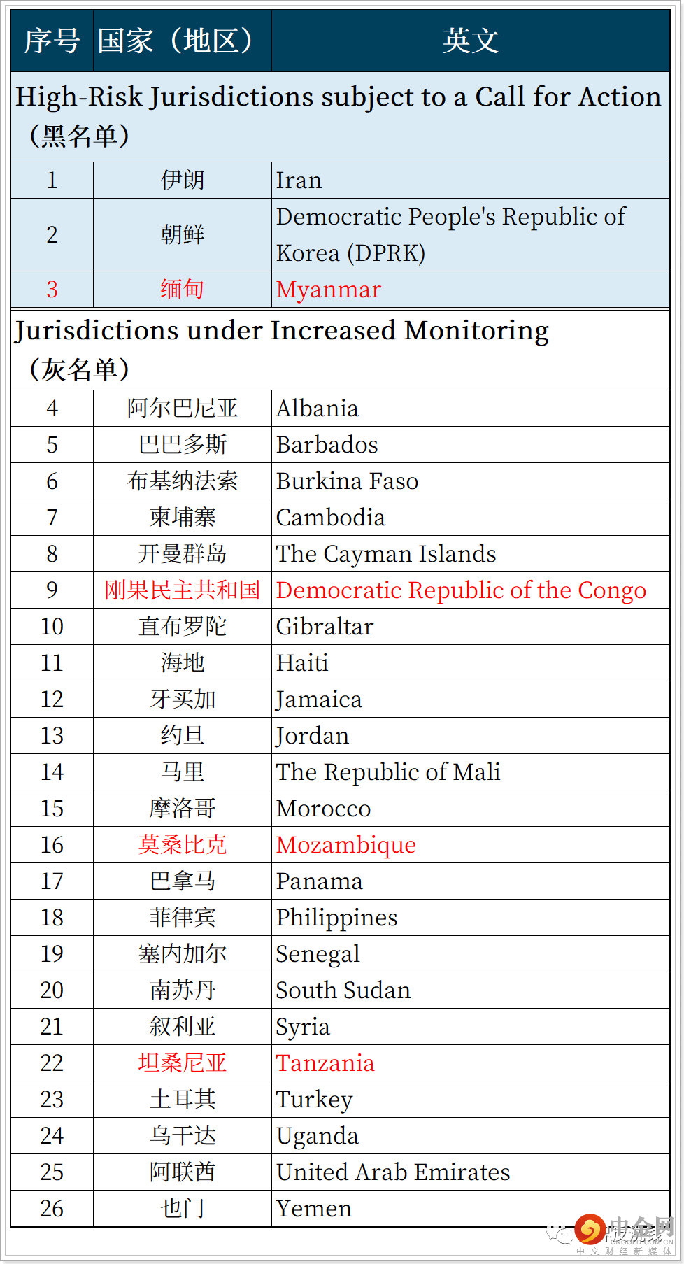 “,包括朝鲜、伊朗和缅甸共3个司法管辖区。其中,缅甸是本次新增至黑名单的国家。应加强监控的司法管辖区,即通常业务理解中的”