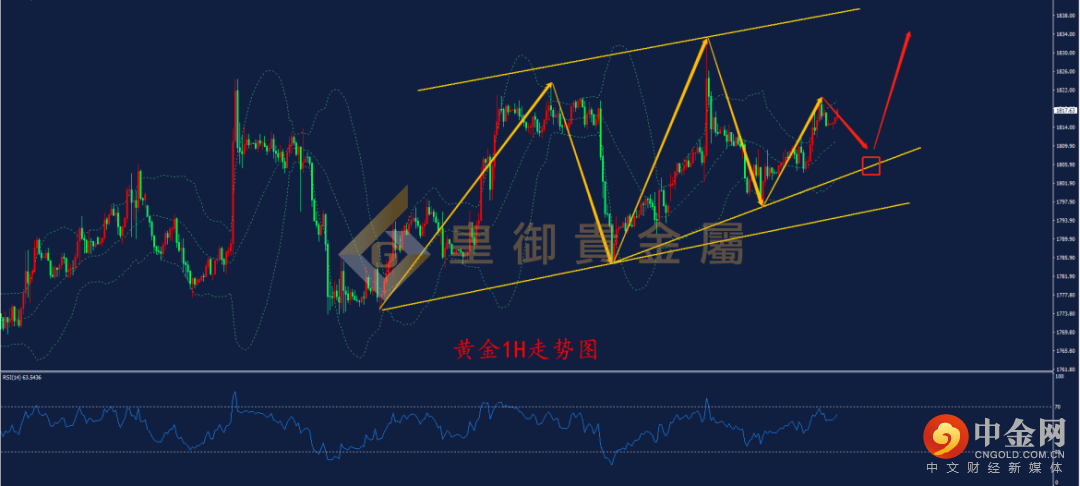 从1H周期走势结构看,近期金价走出高低点逐步抬高的看涨走势,下方趋势线对金价形成支撑,且布林带三轨向上倾斜支撑金价,表明行情呈现偏多走势,下方1806附近的趋势线支撑可以作为较好的多单入场点,该位置同时也是布林下轨支撑附近,企稳后有望测试1833的前高压力。从RSI指标来看,RSI在30.0上方企稳向上攀升,并于70.0附近承压回落,但仍维持在50.0上方运行,后续再度向上测试70.0压力的概率大,日内可以等待价格回落1806支撑附近,尝试轻仓多单。