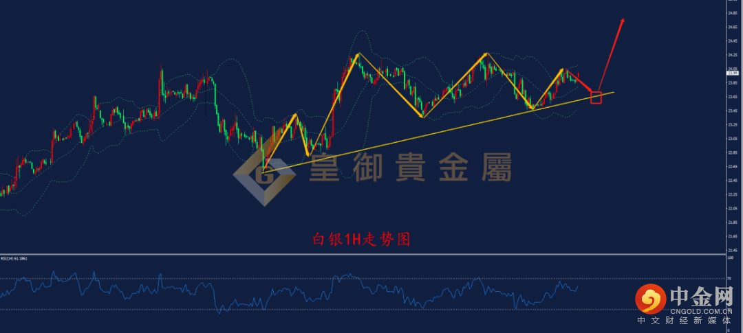 从1H周期走势结构看,白银虽然多次向上测试24.30高点压力未果,但下方低点逐步抬高,暗示多头动能偏强,且布林带三轨向上支撑价格,尤其是布林下轨与支撑线对价格形成支撑,下方23.70的位置可以作为日内较好的多单入场点,上方关注24.30的前高压力,上破后有望打开新的上涨空间。结合RSI指标来看,RSI自30.0附近上涨以来,一直在70.0下方盘整,且始终维持在50.0上方运行,指标在积蓄动能,后续再度拉涨的概率增大,因此日内可以等待价格回落至23.70的支撑线附近,尝试轻仓多单。