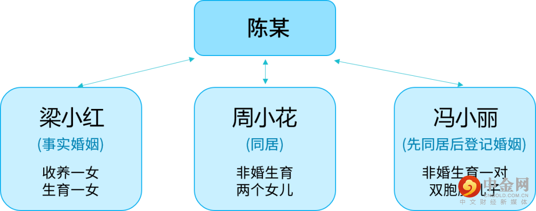 在上世纪八十年代,老陈(化名)与梁小红(化名)同居生活,未登记结婚,两人收养了一名养女陈大(化名),后又生了个女儿陈二(化名)。在此期间,老陈到桂林做生意,与周小花(化名)结识并同居,先后生育了两个女儿陈三与陈四(化名)。