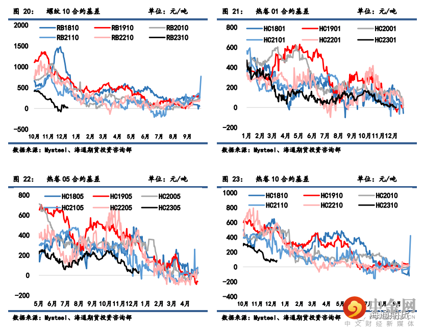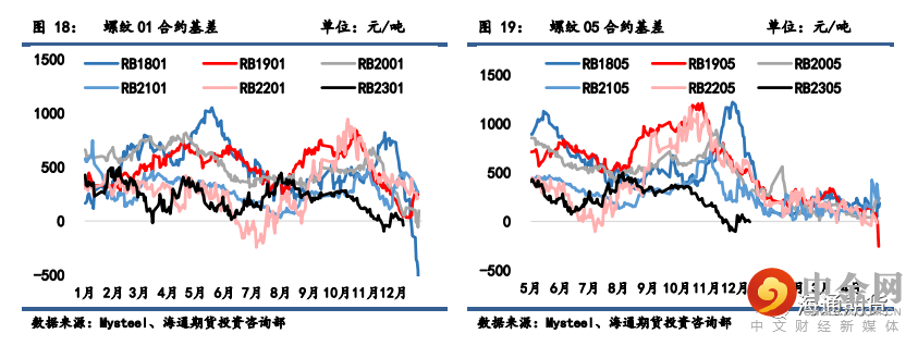 螺纹 01 合约基差从 41 缩小至-40 元/吨,螺纹 05 合约基差从 35 缩小至-5 元/吨,螺纹 10 合约