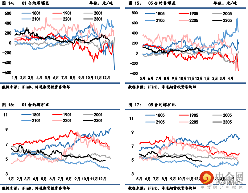 纹钢相当,05 合约卷螺差从 40 先降后升至 38 元/吨;原料铁矿石表现继续强于成材,05 合约螺矿比