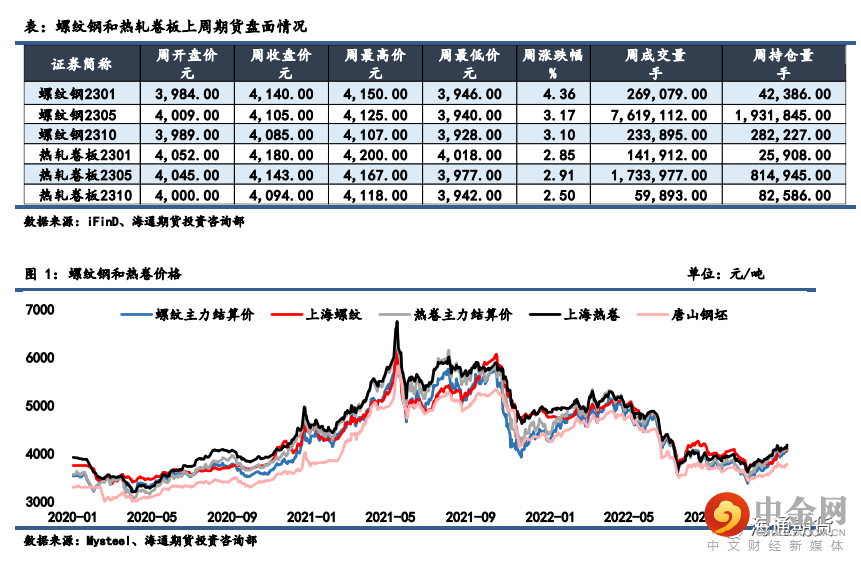 至 4140 元/吨,热轧卷板 2301 合约上涨 2.85%至 4180 元/吨。上周上海螺纹上涨 60 元/吨至 4100 元