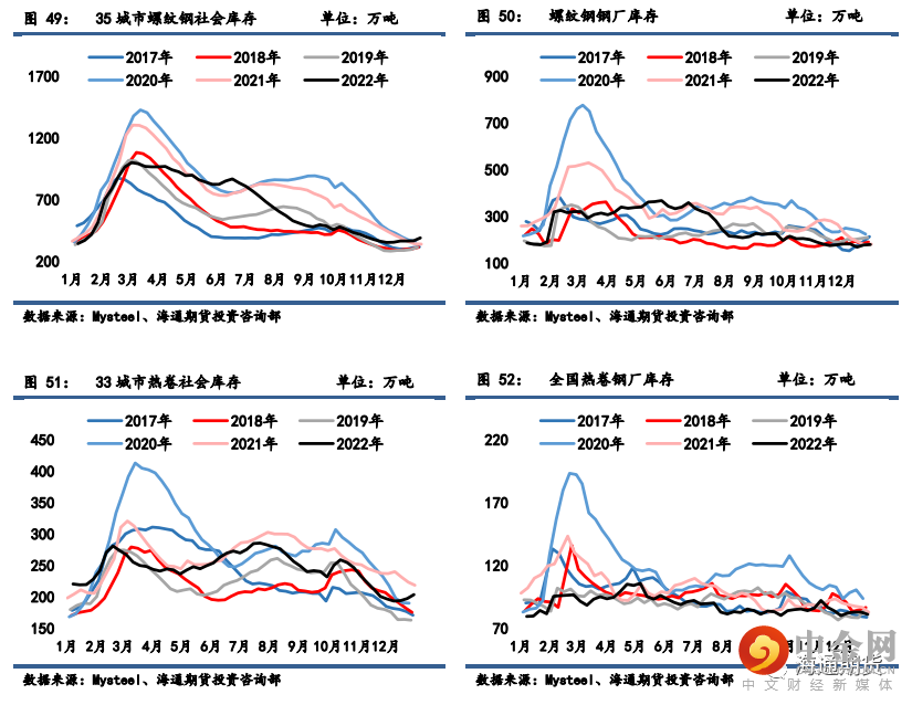 库存:螺纹钢和热卷库存整体延续累库态势,仅热卷厂库环比微降,