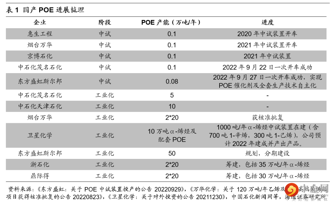 国产化技术突破在即。现阶段国内POE尚未实现工业化,其研发难点主要集中在茂金属催化剂以及共聚单体α烯烃等。目前国内万华化学、中石化茂名石化、东方盛虹斯尔邦等已经完成POE中试,中石化天津石化、卫星化学、浙石化、鼎际得等企业也在积极规划POE产能,国产化布局加快。此外,卫星化学、浙石化等也在布局上游α烯烃原料。