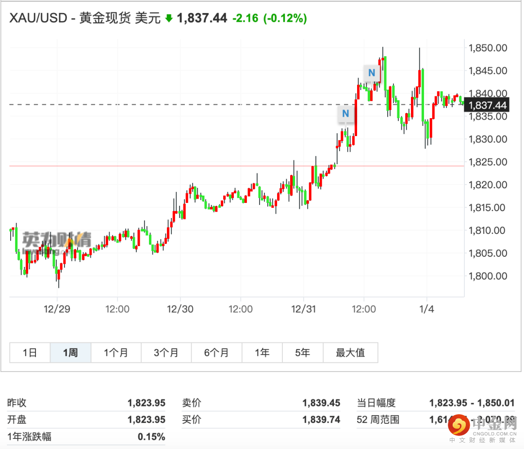 具体行情显示,日内欧市盘初,现货黄金价格一度升破1850关口,最高报每盎司1850.01美元,为近六个月以来的最高水平,现回落至1837美元附近。