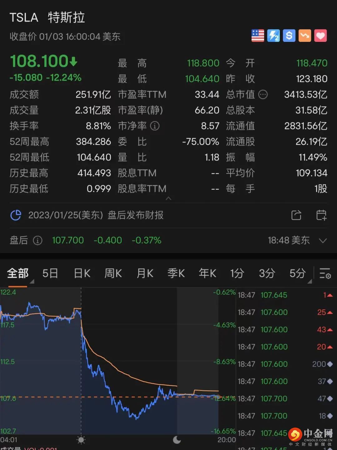 特斯拉(TSLA)收报108.1美元,跌幅12.24%,市值3413.5亿美元。市值一夜蒸发约476亿美元(约3292亿元人民币)。
