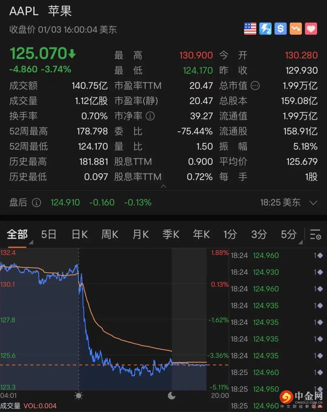因媒体报道的砍单传闻影响,美股“股王”苹果公司(AAPL)收跌近4%,市值也跌破2万亿美元关口,报1.99万亿美元。市值一夜蒸发773亿美元(约5345亿元人民币)。这是苹果市值18个月以来首次跌破2万亿美元关口。