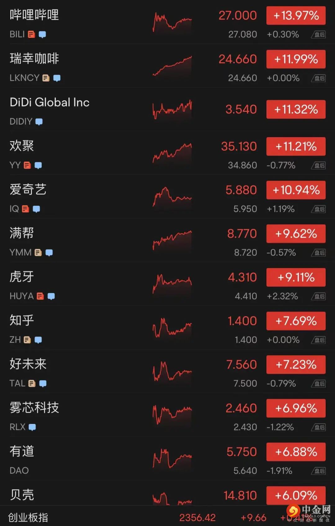 其他个股中,B站涨近14%,爱奇艺涨超11%,满帮涨超9%,11%,满帮涨超9%,微博、网易、唯品会涨超5%,阿里巴巴、腾讯音乐涨超4%,腾讯ADR涨超5%,理想汽车、小鹏汽车涨超2%。富途控股跌超6%,蔚来跌近1%。
