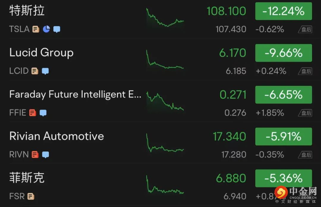 在特斯拉的拖累下,美股新能源汽车类股普跌,Lucid集团跌近10%,“特斯拉劲敌”Rivian 跌近6%,均创上市以来最低,Lordstown Motors跌近1%,Fisker跌超5%。