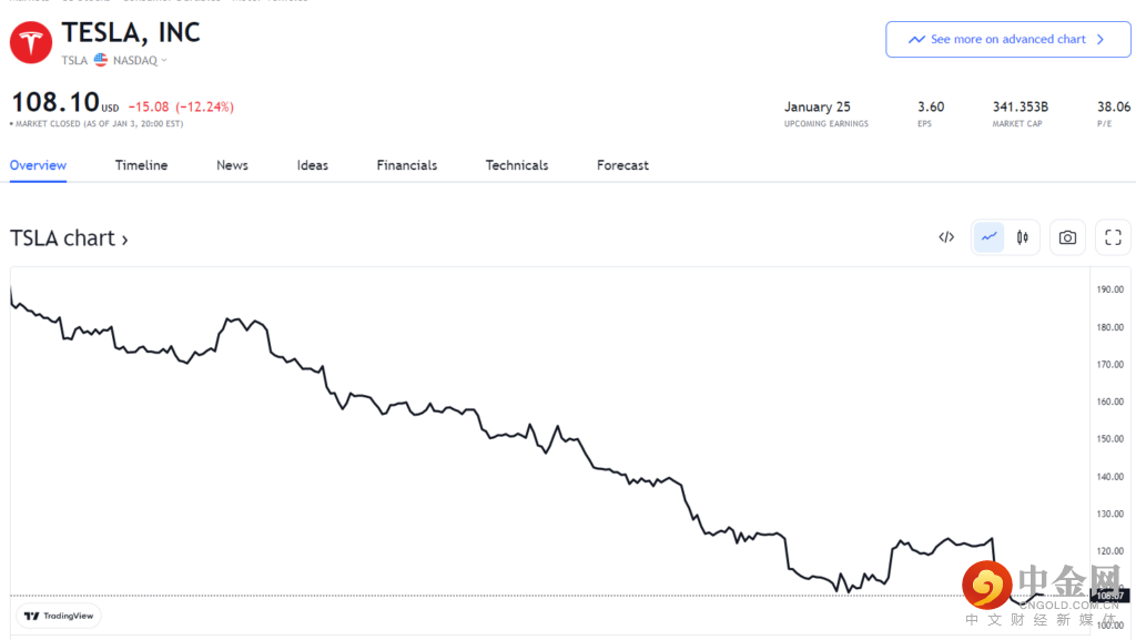 特斯拉盘初暴跌近 10%,盘中最深跌 15%,后跌幅小幅收窄,收跌 12.24%,报108.10,创逾两年最差表现,同时刷新自 2020 年 8 月份以来盘中最低位 104.64 美元。其市值一夜跌掉近 480 亿美元,现总市值 3413.53 亿美元。
