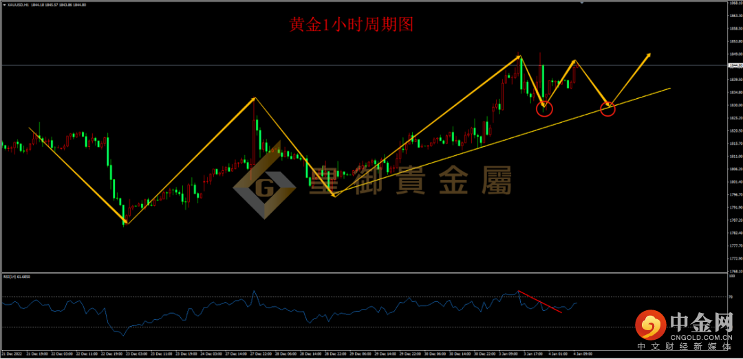 从1H周期走势结构看,黄金昨日亚盘时段冲高,一度冲击1850一线,从目前周线结构看,黄金仍处于上升趋势,但上方面临两大重要阻力,一个是自2070以来的斐波那契回调线50%分位阻力,一个是云图周线级别云层压力,阻力集中在1842-1855区间,短线来看,1小时级别RSI下行趋势线突破,预计黄金仍有上冲动能,但重点关注冲高之后是否会有受阻情况,今日可先保持多头思路。