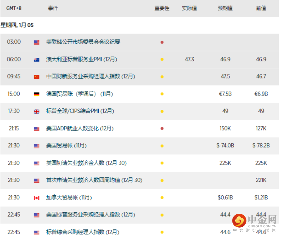 中国财新服务业PMI、美国ADP就业和初请失业金人数、加拿大贸易账