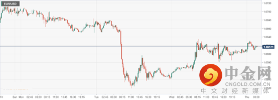 欧元兑美元周三收盘微幅上涨后,今日开盘盘整在1.0617附近,由于通胀压力减弱,乐观情绪使欧元获得上行提振。