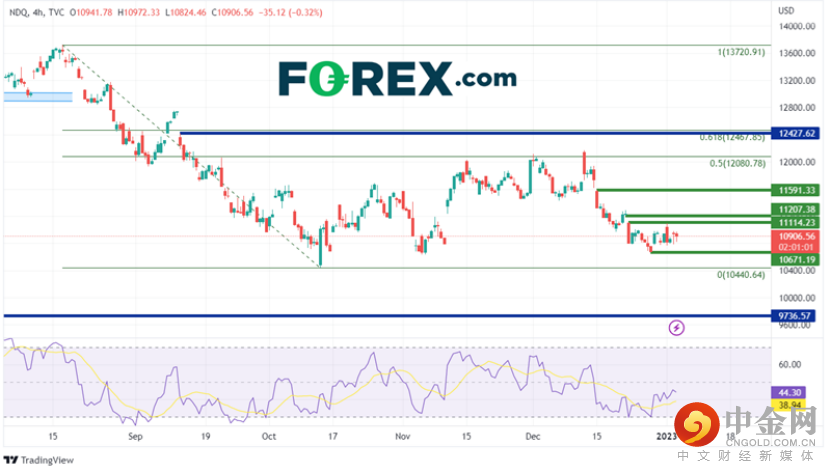 在240分钟图上,纳斯达克100指数自9月中旬以来一直在区间波动,交投于10月13日的低点10440.64以及从8月16日的高点到10月13日的低点区间的50%回撤位12080.78之间。鹰派的美联储会议纪要验证了2022年12月15日的会议结果。如果该指数继续走低,第一个支撑位在12月28日的低点10671。在此之下,价格可能会跌至10月13日的低点10440,然后是2020年7月的水平支撑位9736.57。然而,如果市场将会议纪要的鹰派视为“老调重弹”,纳斯达克100指数可能会形成涨势。第一个阻力位于2022年12月22日开盘的缺口位11114.23,然后是前一天的补缺位11207.38。在此之上,指数可能会触及2022年12月15日高点的开盘缺口位11591.33。