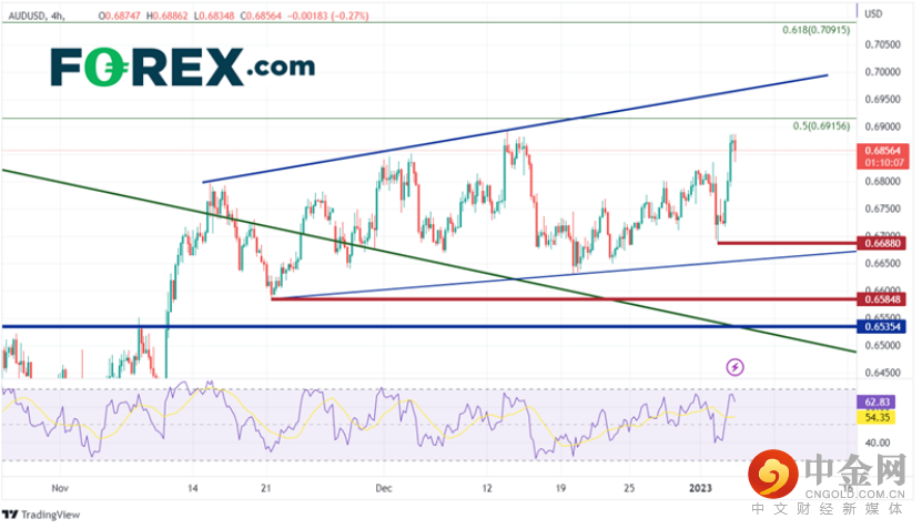 从4小时图上看,在突破长期下降通道(绿色线)后,澳元/美元在2022年50%回档位附近形成新通道,缓步上升。由此向上遇到的第一个阻力位将落在0.6915,随后会在新通道上轨0.6968附近遇阻。如果货币对价格由此继续走高,将在61.8%回档位附近的 0.7092遇到第三个阻力位。如果阻力位守关成功,澳元/美元未能向上突破通道,转而下跌,则可在1月3日低点0.6688找到第一个支撑位。继续向下,价格可能抵达新通道下轨0.6652附近,最后在11月22日的0.6585高点找到支撑。