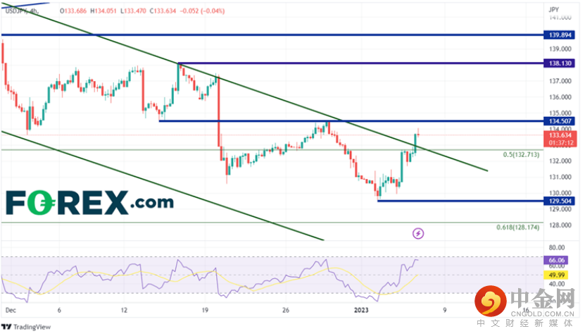 从4小时图来看,美元/日元逐步靠近此前支撑位,即12月28日高点134.50,并在此位置形成第一阻力位。由此向上,货币对可升至200天移动均线136.40(见日线图),随后抵达12月15日高点138.13。一旦突破长期通道未能成功,美元/日元或会在假突破后回撤。第一支撑位落在通道上轨132.70附近。由此向下,交投价或会跌至1月2日低点129.67,最后在2022年年度低点至高点之间61.8%回档位128.17附近找到支撑位。