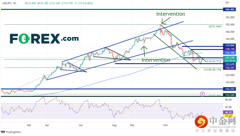 美元/日元曾在2022年前三季度飞速上涨,从2022年1月14日的低点113.48一路高歌猛进至10月21日的高点151.95。达到峰值后,货币对旋即回撤进入有序下降通道,年底收盘低于2022年高点至低点的50%回档位130.77。美元/日元在2022年8月2日低点130.39形成的水平支撑位稍事停留后,本周转而向上攀升。周二至周四货币对交投量攀升,在通道上轨133.62附近跃跃欲试,有望突破。