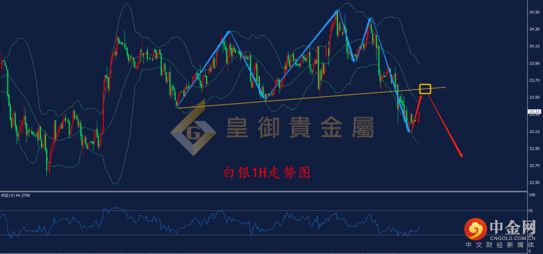 从1H周期走势结构看,昨日价格下破支撑线,且布林三轨向下压制价格反弹,价格呈现高低点逐步下移的看空形态,表明行情由多转空的概率增大,上方关注23.60的支撑线的多空压力转换位,该位置可以作为较好的空单入场点,下方关注22.55的前低支撑。结合RSI指标来看,RSI虽然自30.0下方反弹,但仍维持在50.0的多空分水岭下方运行,表明后续再度向下测试30.0的概率增大,日内可以等待价格反弹23.60的压力附近,尝试轻仓空单。今日非农数据,行情波动将被放大,投资者需密切关注具体数据对金价产生的影响,把握盘中实时交易机会!