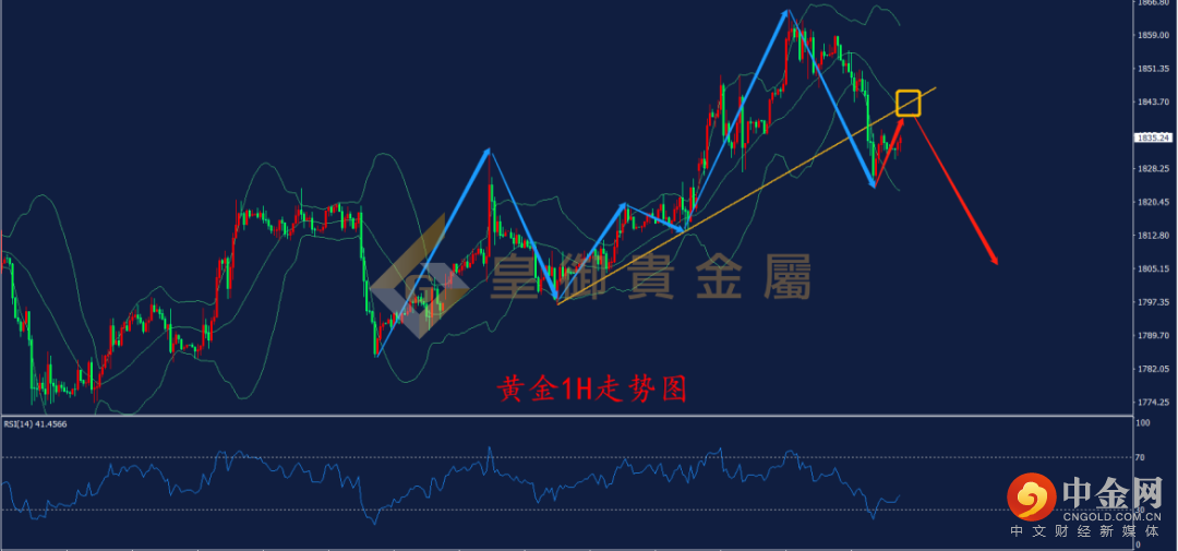 从1H周期走势结构看,昨日金价下破上升趋势线的支撑,且布林三轨向下压制金价,表明行情呈现偏空走势,上方1842为布林中轨及趋势线支撑压力转换位的共振压力位置,可以作为日内较好的空单如入场点,一旦承压,向下测试1800整数支撑的概率增大。从RSI指标来看,RSI虽然自30.0下方反弹,但仍维持在50.0的多空分水岭下方运行,表明后续再度向下测试30.0的概率增大,日内可以等待价格反弹1842的压力附近,尝试轻仓空单。今日非农数据,行情波动将被放大,投资者需密切关注具体数据对金价产生的影响,把握盘中实时交易机会!