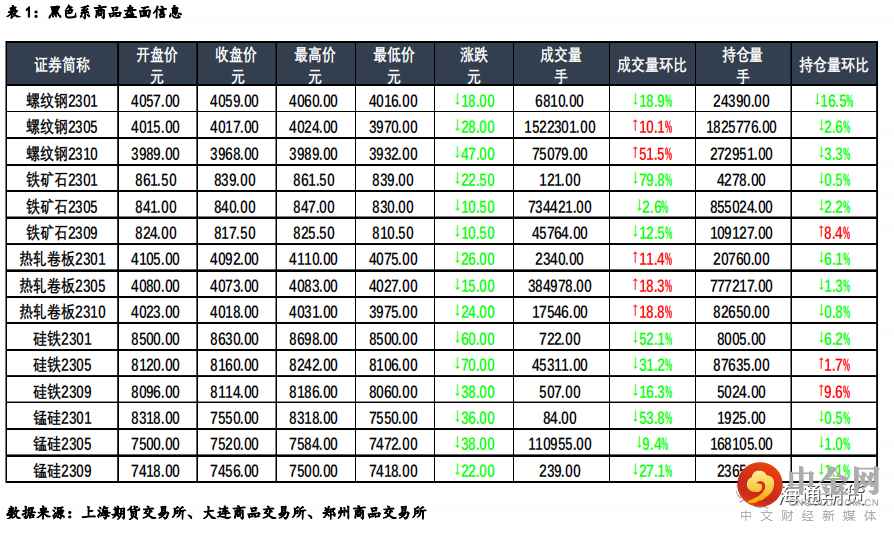 钢材:今日主力合约呈震荡走势,上海螺纹下跌 10 元/吨至 4110 元/吨,上海热卷下跌 30 元/吨至 4100 元/吨。螺纹 05 合约,永安期货买单持仓减少6326 手,卖单持仓减少 5570 手;前二十名期货公司买单持仓减少 13403手,卖单持仓减少 34367 手。钢联数据显示,1 月 4 日全国建材成交量合计9.29 万吨、环比降低,低于上周的成交量均值 11.0 万吨,本期全国样本钢厂螺纹钢周产量为 247.75 万吨,环比大幅降低 23.88 吨,热卷产量周环比小幅减少 7.92 万吨至 301.11 万吨,螺纹社会库存周环比大幅累库 46.7 万吨至 436.56 万吨,钢厂库存环比降低 11.02 万吨至 168.11 万吨,螺纹总库存持续上行,螺纹表需周环比大幅降低 34.61 万吨至 212.07 万吨、同期偏低水平,热卷社库周环比增加 17.79 万吨至 304 万吨,厂库为 82.39 万吨、周环比基本持平,热卷表需为 290.36 万吨、周环比下降 13.89 万吨,同期仍处偏低水平。从本期数据来看,螺纹、热卷产量均有下降,螺纹产量降幅更为明显,库存方面成材均继续累库,并且两者表需均有明显降幅,消费淡季的特征明显。短期来看,多地疫情感染人数仍处增加态势,叠加传统淡季时段,成材消费低迷、社库加速上行,弱现实的基本面无法为盘面上行提供驱动,并且市场再度传言澳煤放开进口,成材的成本端有所松动,预计此轮黑色系商品的强势反弹告一段落。但当前市场对后市的需求复苏尚无法证伪,叠加今日钢联数据显示螺纹产量降幅较大、近期钢厂低利润亦能为盘面提供一定支撑,因此预计短期盘面呈震荡偏弱走势。