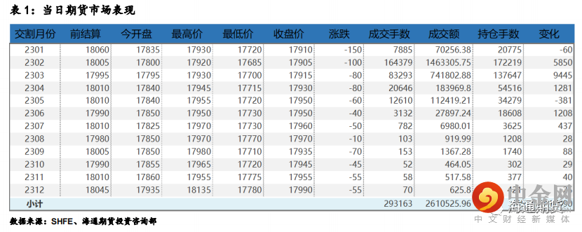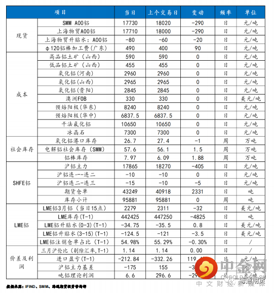 沪铝早盘下跌,午后跌幅收窄,主力合约 2302 收盘跌 100 元至17905元/吨,跌幅为0.56%;当日15:00收盘伦敦三月铝报价2279.00美元/吨。现货方面,华东地区成交集中在 17710-17750 元/吨,现货升贴水较昨日回落 20 元贴水 60 元/吨附近。中原(巩义)地区成交集中在 17540-17580 元/吨,现货升贴水较昨日回落 50 元至贴水230 元/吨。铝价下跌市场上出货偏多,下游年前囤货情绪较为犹豫,成交积极性不佳,现货贴水走扩。产业方面,截至 2023 年 1 月 05日国内电解铝社会库存 57.6 万吨,较上 12.29 日上周四的库存增加8.3 万吨,较元旦后首日库存 1.5 万吨,较去年同期库存下降 20 万吨。