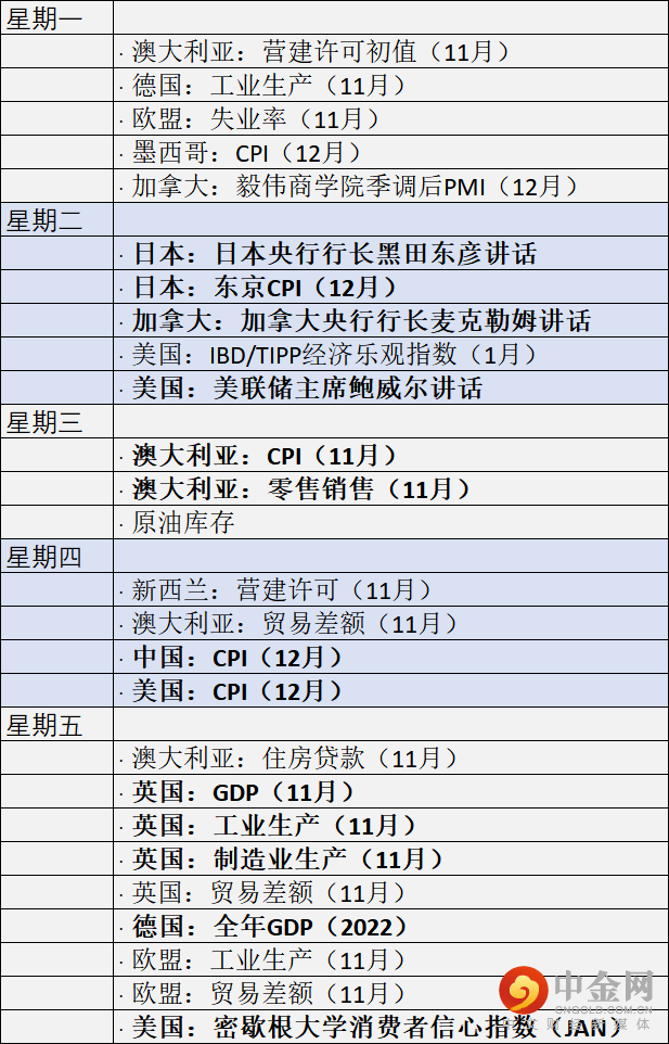 本周,美联储主席鲍威尔将参加斯德哥尔摩举办的“以发展的观点看央行的独立性和授权”研讨会。交易者可重点关注鲍威尔是否会提及美联储如何看待就业数据和PMI萎缩。一旦释放一丝鸽派立场,股市即会上涨,美元应声下跌。此外,美国12月CPI数据将在周四公布。预期认为整体数据将达到6.5%,较前值7.1%有大幅回落。核心CPI预期从前值6%跌至5.7%。整体通胀指数在6月到达最高值9.1%后步步下挫,而核心数据则更为坚挺。如果数据表现弱于预期,美国股市会进一步上升,而美元会进一步下跌。
