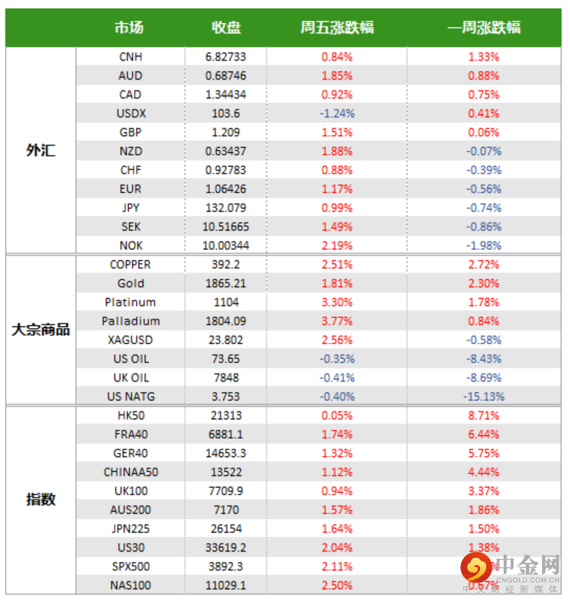 受此影响,美元回吐周中大部分涨幅但周线小幅收高,美股在周五和上周集体上涨,黄金不仅连续三周上扬且涨幅持续扩大。中国重启的乐观期待令港股、中概股和人民币上周涨势喜人,但并未提振原油价格。国际原油上周跌幅超8%。