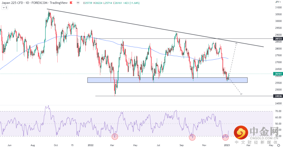日经指数结束了连续三周的下跌,周五在支撑区域形成了看涨吞噬的K线形态,RSI指标从超卖区域回升。对多头来说,当前的位置拥有不错的潜在盈亏比,上方目标可以关注200天均线、趋势线以及震荡区间上沿。反之,前低24556是非常明确的下方支撑。