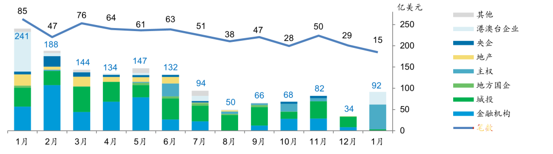 一级市场新发行方面,今年开年中资离岸债券市场发行活跃,共发行15笔债券,发行规模约92亿美元。中国香港特别行政区政府新发8笔合计约58亿美元等值的绿色主权债,发行币种包括人民币、欧元及美元,其中30年期美元债认购逾16倍,在二级市场受到配置盘追捧。另外,香港机场管理局上周发行了合计30亿美元的高级无抵押固息债券,整体获逾8倍超额认购